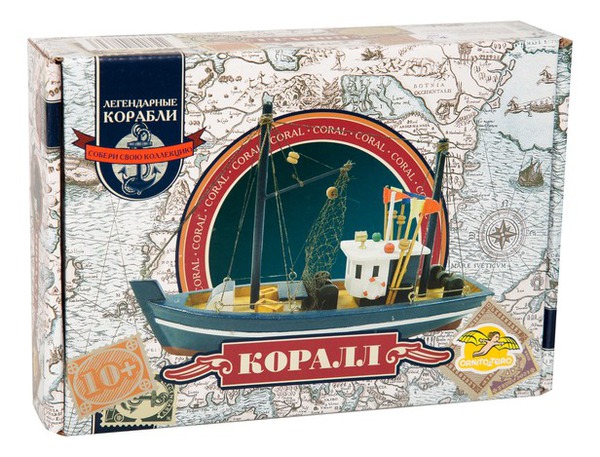 В набор входят: деревянные детали корабля, паруса, флажки, снасти, баночка клея, краски. Рекомендуется для детей от 10 лет.
