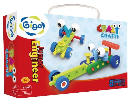 Из Конструктора Gigo "Junior engineer - crazy crafts" (Гиго. Юный инженер - cумасшедшие штучки) можно собрать восемь глазастых и необычных машинок по инструкции или придумать свои собственные конструкции. Модели получаются большими, а благодаря тому, что колеса могут вращаться, получаются отличные игрушки-каталки. При этом ребенок учится распознавать цвета и формы, развивает ассоциативное мышление, ведь для этих игрушек надо найти аналоги в реальном мире. В комплекте 28 деталей. Для детей от 1-го года.