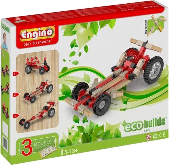 С конструктором ENGINO "Автомобили" из серии Eco builds Ваш ребенок быстро и легко соберет по очереди 3 модели автомобилей, а красочная и пошаговая инструкция поможет в начинаниях. Деревянные детали с отверстиями составляют основу моделей, пластиковые соединительные элемены обеспечивают прочные соединения и обеспечивают технике подвижность. Никакого клея!