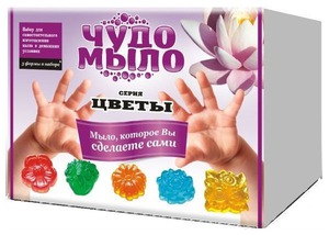 С помощью набора Чудо-мыло "Цветы" ваш ребенок сможет изготовить своими руками ароматное мыло в виде очаровательных цветов. Набор содержит все необходимое для работы: прозрачная мыльная основа (150 г.), красители и ароматизаторы (2 шт.), керамическая чаша для растапливания мыла, перчатки, палочки для размешивания, формы для мыла (3 шт.).